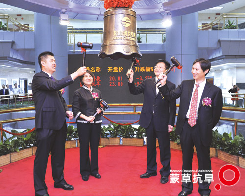9月27日上午9時(shí)25分,公司董事長(zhǎng)王召明敲響深圳證券交易所上市寶鐘,內(nèi)蒙古和信園蒙草抗旱綠化股份有限公司在深圳證券交易所首發(fā)A股股票并在創(chuàng)業(yè)板成功上市,股票簡(jiǎn)稱(chēng)“蒙草抗旱”,股票代碼“300355”。公司股票開(kāi)盤(pán)表現(xiàn)強(qiáng)勁,大漲94.92%,創(chuàng)出了今年深交所新股上市首日最大漲幅。