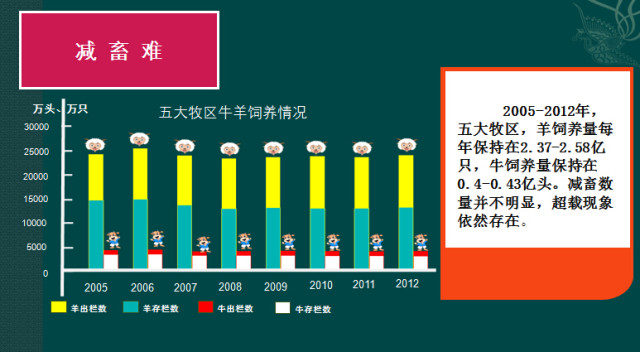 一個硬骨頭是減畜困難。從2005年到2012年我國的五大牧區(qū),羊的適養(yǎng)量每年均保持在2.4%到2.6%左右,牛的適養(yǎng)量也是在0.4—到0.43億頭左右。減畜的數(shù)量并不是很明顯,好在我們的牧場產(chǎn)量在增加,所以我們的載畜量還是有所下降的。