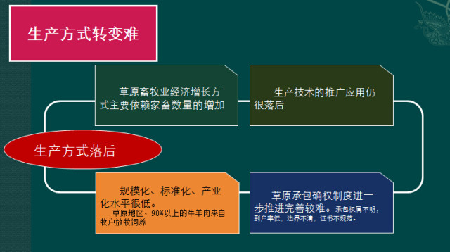 第二個硬骨頭是市場方式轉(zhuǎn)變還比較冷,主要體現(xiàn)在我們經(jīng)濟增長方式主要依賴家畜數(shù)量的增長。規(guī)模化、產(chǎn)業(yè)化水平還比較低,生態(tài)環(huán)境的利益比較落后,還需要進一步的完善。