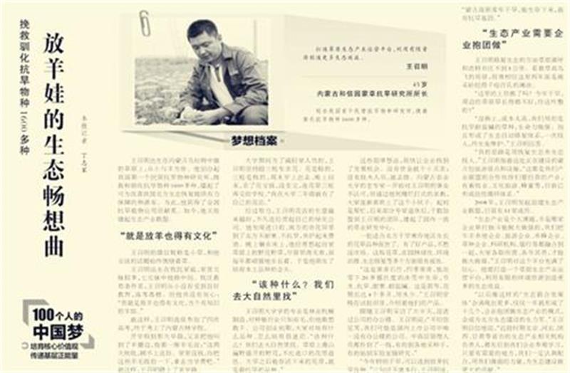 一個(gè)出生在內(nèi)蒙古烏拉特中旗的草原上,從小與羊?yàn)榘榈姆叛蛲蓿瑒?chuàng)辦起我國(guó)第一個(gè)民營(yíng)抗旱物種研究所。挽救和馴化抗旱物種1600多種,建起了可為改善我國(guó)北方生態(tài)恢復(fù)提供有力保障的種源庫(kù)。為此,他獲得了全國(guó)抗旱植物應(yīng)用貢獻(xiàn)獎(jiǎng)。如今,他又組建起生態(tài)產(chǎn)業(yè)聯(lián)盟。