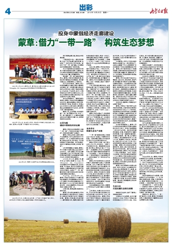 2015年10月26日,內(nèi)蒙古日報全版刊登文章“投身中蒙俄經(jīng)濟走廊建設(shè)--蒙草:借力“一帶一路”構(gòu)建生態(tài)夢想”