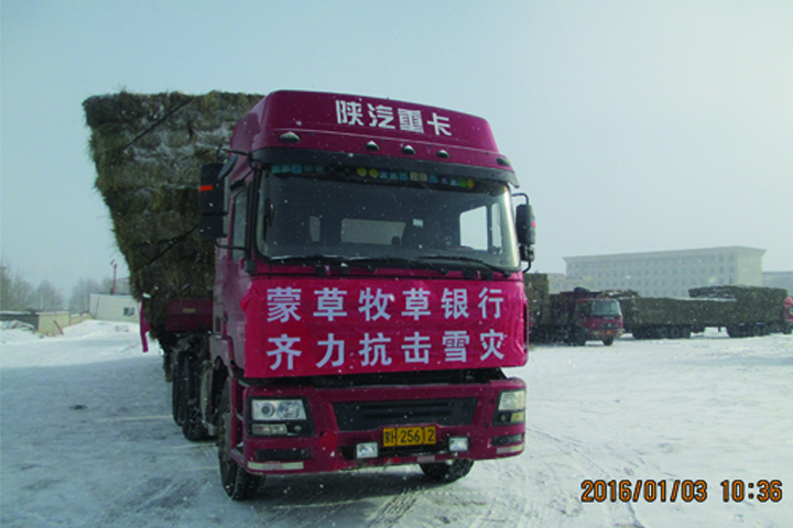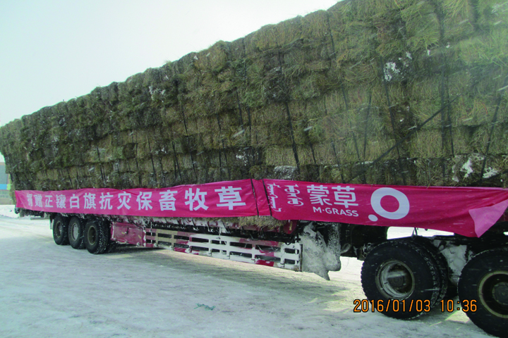 蒙草牧草公司當(dāng)即啟動(dòng)牧草銀行儲(chǔ)備,緊急調(diào)撥價(jià)值200萬(wàn)元天然牧草馳援正鑲白旗。2016年1月3日,克服重重困難,行程4天,緊急馳騁1000余公里,首批300噸牧草,終于抵達(dá)正鑲白旗,按每車(chē)30噸載荷,其他40多大車(chē)的牧草將陸續(xù)抵達(dá)。3日當(dāng)天當(dāng)?shù)卣M織了捐贈(zèng)儀式,蒙草牧草東烏旗副總經(jīng)理格根其日與蒙草第九事業(yè)部總經(jīng)理曲麗共同參加捐贈(zèng)儀式。