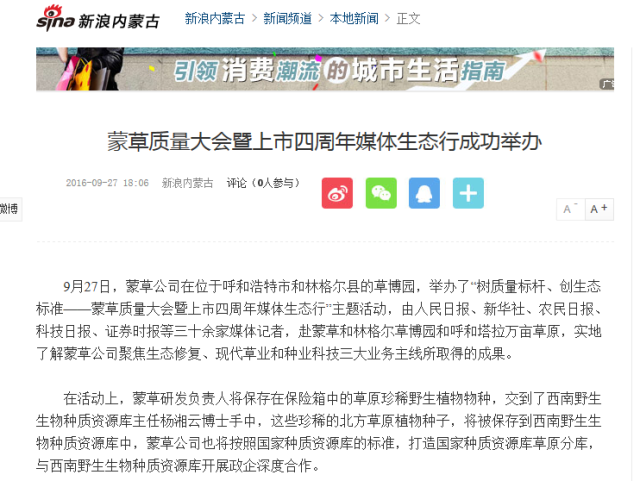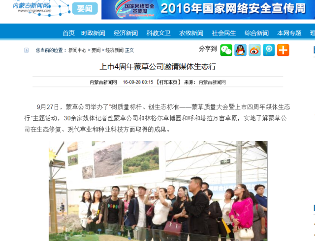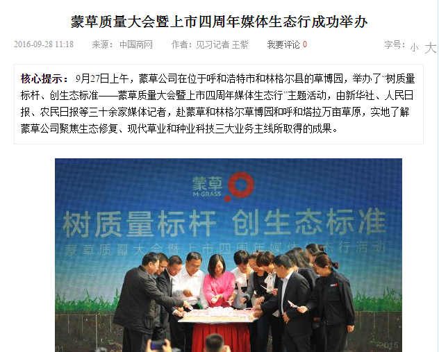 2016年9月27日,以“樹質(zhì)量標(biāo)桿、創(chuàng)生態(tài)標(biāo)準(zhǔn)”為主題的蒙草質(zhì)量大會暨上市四周年媒體生態(tài)行活動在蒙草草原鄉(xiāng)土植物館拉開帷幕?;顒悠陂g,全國四十余家媒體記者共赴蒙草和林格爾草博園和呼和塔拉萬畝草原,實(shí)地了解蒙草公司聚焦生態(tài)修復(fù)、現(xiàn)代草業(yè)和種業(yè)科技三大業(yè)務(wù)主線所取得的成果。
