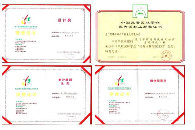 鷺路興秉承“精致園林,生態(tài)園林”的核心理念,以新穎、美觀、實(shí)用的規(guī)劃設(shè)計(jì)和高效優(yōu)質(zhì)的工程質(zhì)量完成了國(guó)家、省、市一系列重點(diǎn)綠化工程。其中“廈門園博園民族風(fēng)情園園林景觀綠化工程”、“深圳灣濱海休閑帶C段景觀工程(標(biāo)準(zhǔn)示范區(qū))”以及“廈門市五緣灣內(nèi)灣旅游休閑道路及景觀工程A2標(biāo)段”等工程先后獲得中國(guó)風(fēng)景園林學(xué)會(huì)“優(yōu)秀園林綠化工程”金獎(jiǎng)和銅獎(jiǎng)。