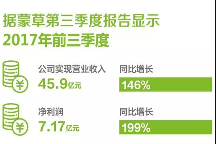 據(jù)蒙草第三季度報(bào)告顯示,2017年前三季度,公司實(shí)現(xiàn)營業(yè)收入45.9億元,同比增長146%,凈利潤7.17億元,同比增長199%。有財(cái)經(jīng)媒體分析,蒙草高速增長的背后,一方面由于有充足的在手訂單儲(chǔ)備,另一方面體現(xiàn)了蒙草較好的市場(chǎng)適應(yīng)能力和戰(zhàn)略前瞻性。