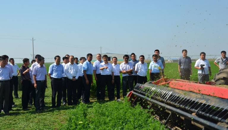 巴特爾主席一行在我公司觀看紫花苜蓿收割過程 8月19日,自治區(qū)主席巴特爾在赤峰市長包滿達,阿魯科爾沁旗相關領導一行的陪同下,來蒙草